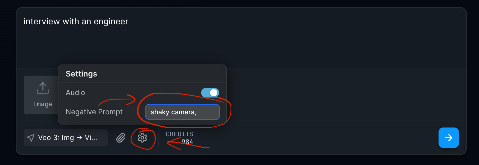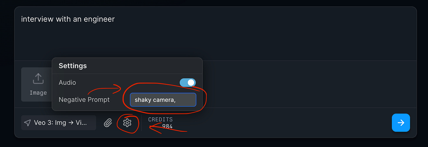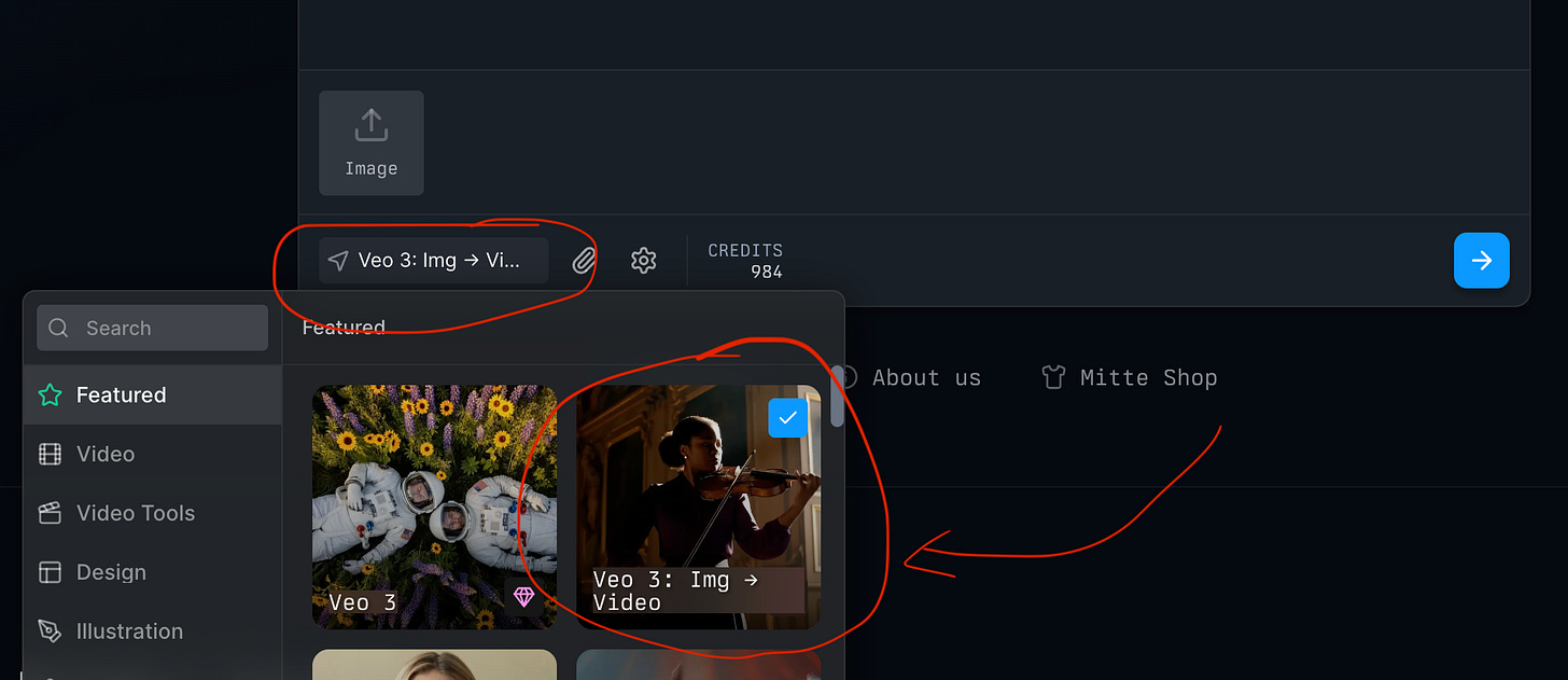 To add them, click the “Settings” icon after selecting “Veo 3” model on mitte.ai’s menu: